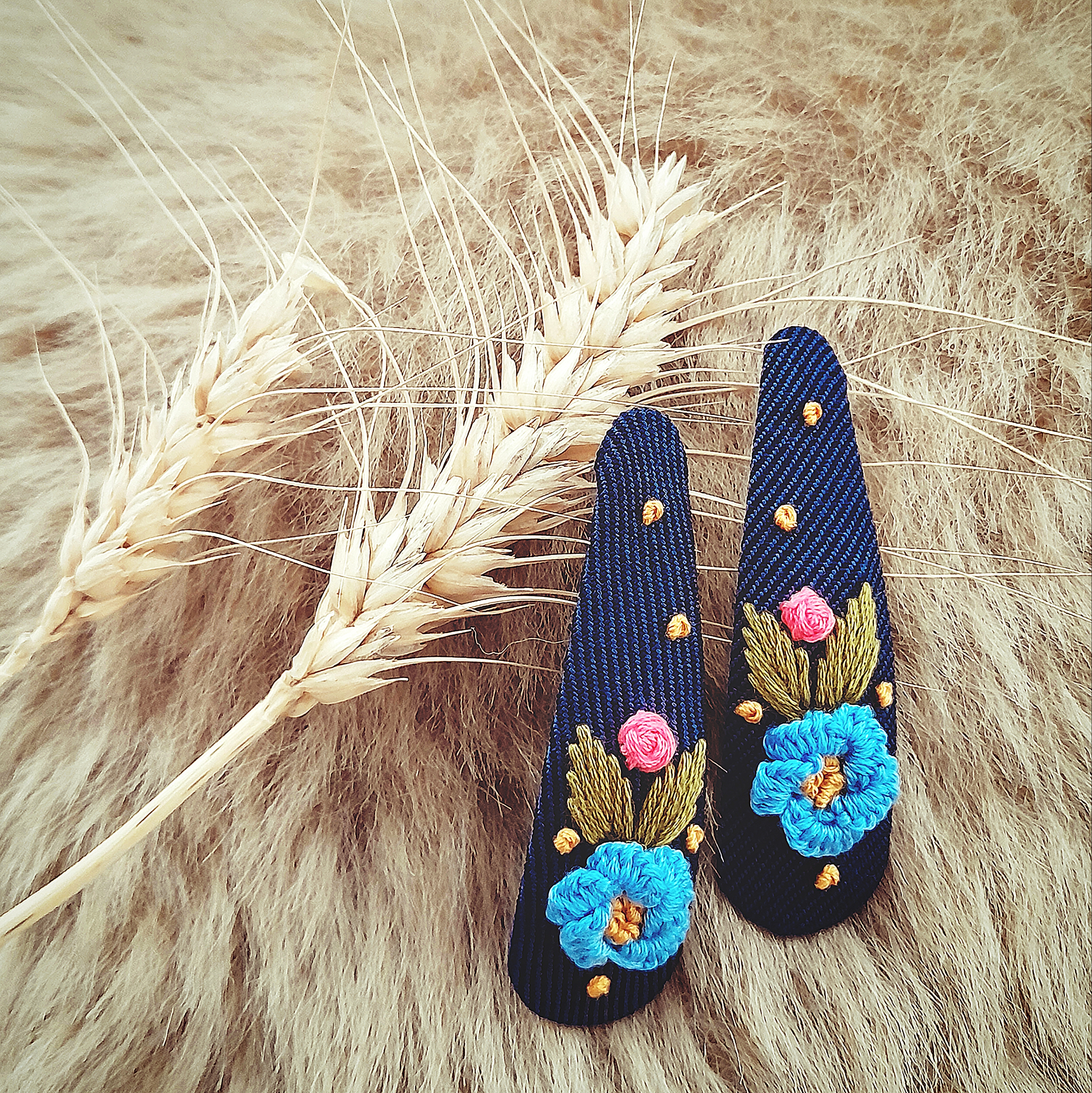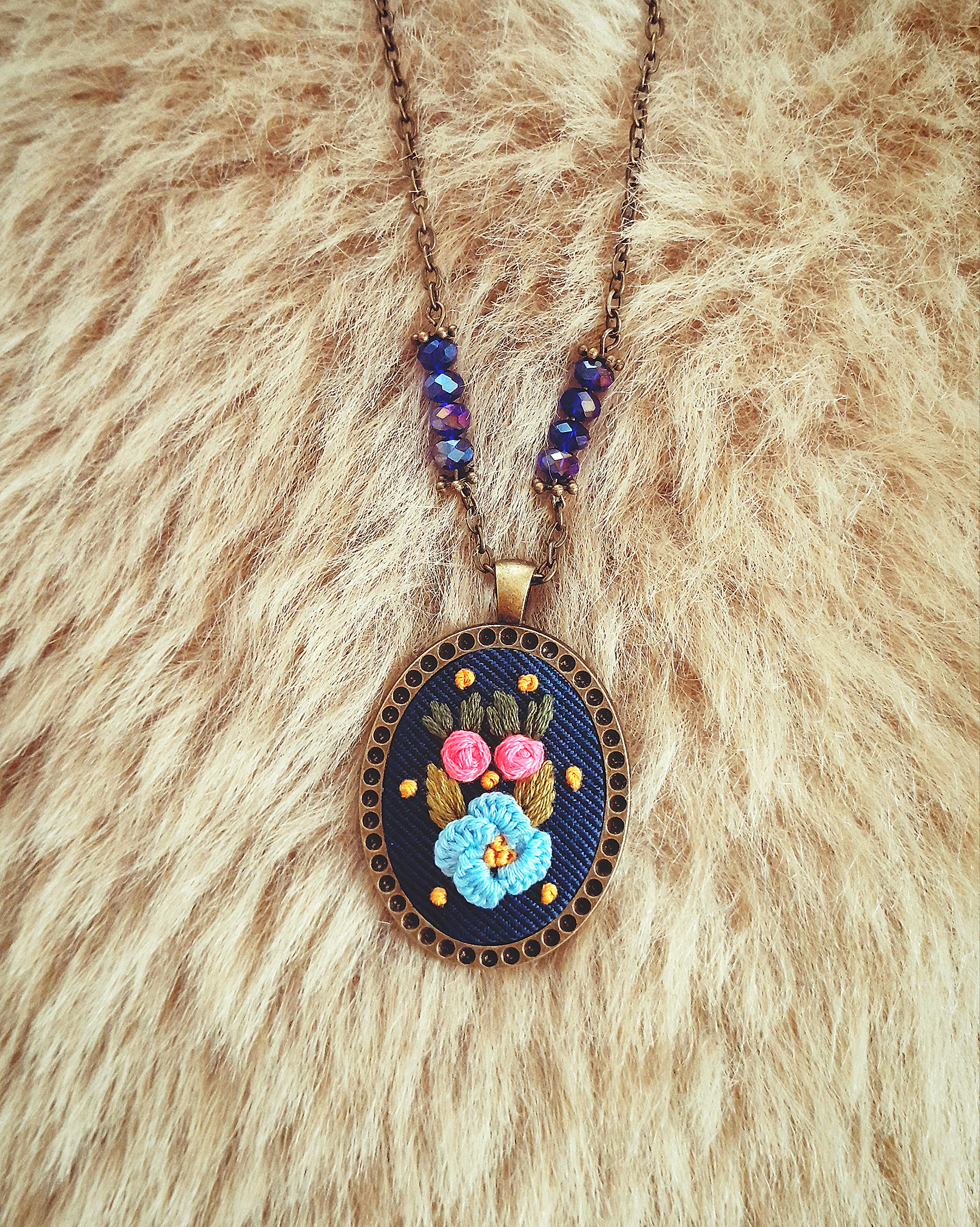 پارچه به کاربرده شده کتان سورمه ای و گلدوزی با نخ دمسه فرانسه.
